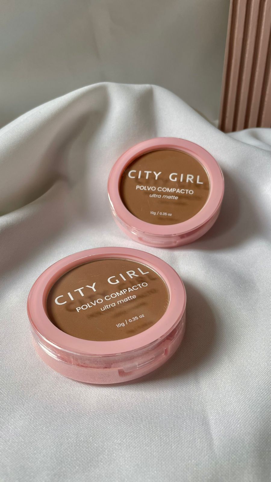 Polvo compacto con espejo y esponja.