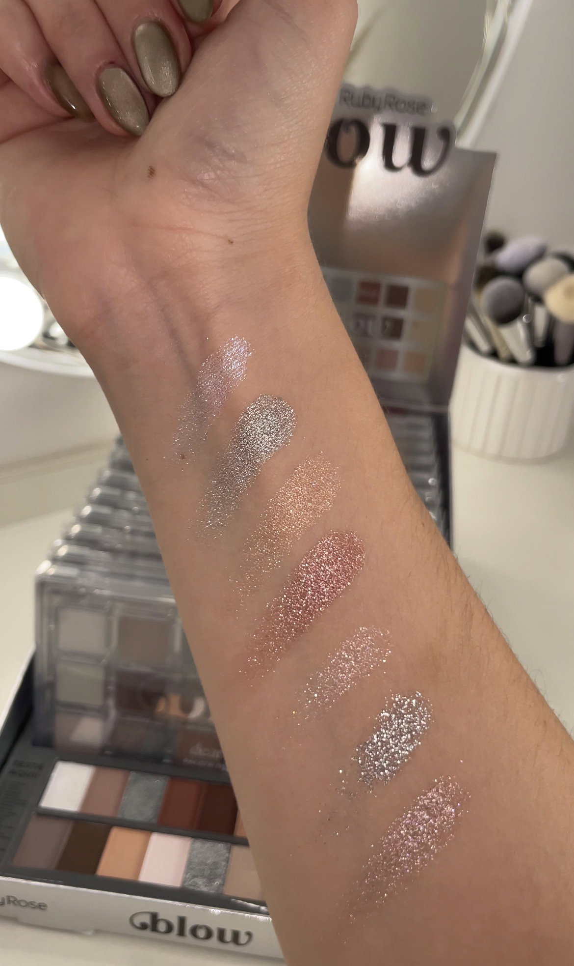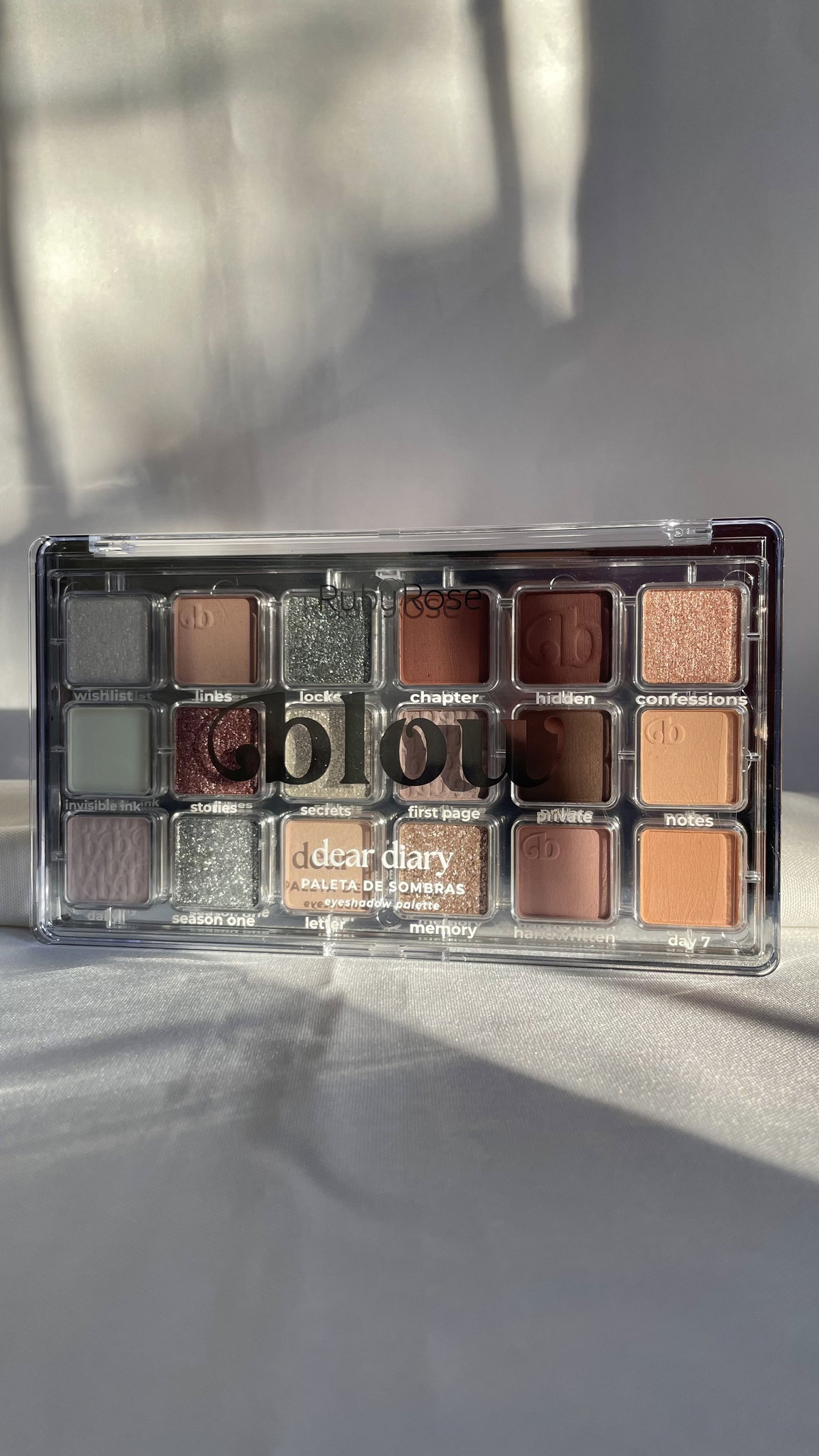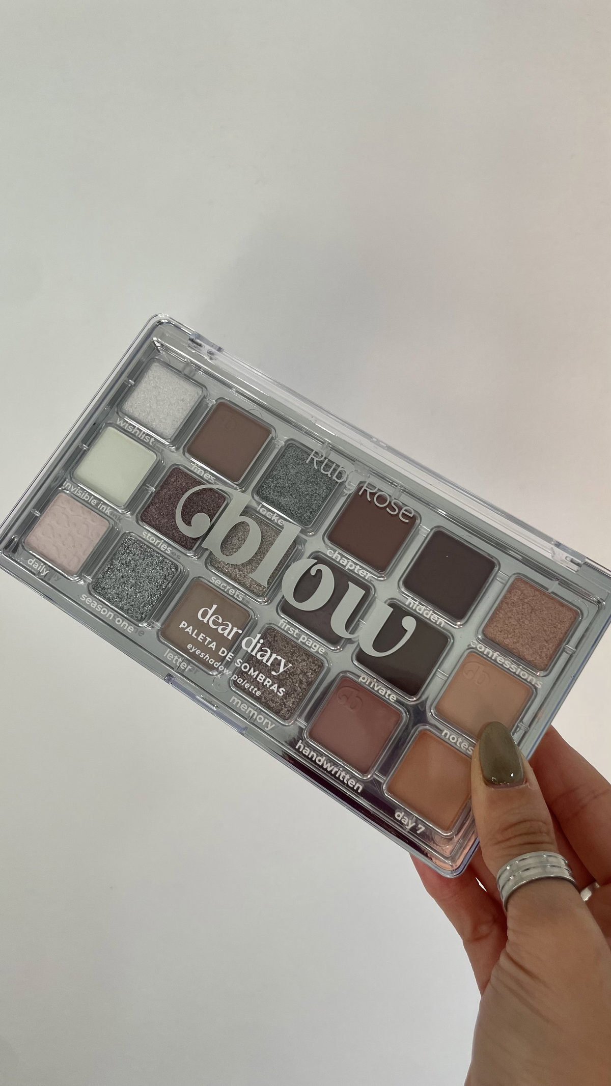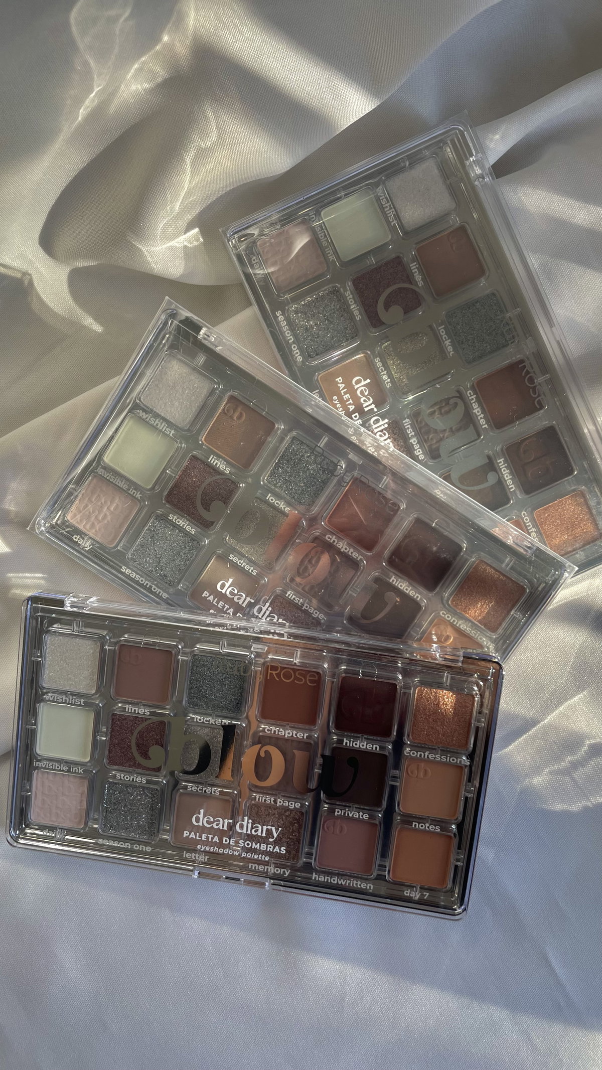 La paleta Dear Diary presenta una elegante mezcla de tonos suaves e intensos, que incluyen tonos nude, grises, plateados, dorados y marrones, ideales para looks versátiles que van desde lo clásico hasta lo sofisticado.